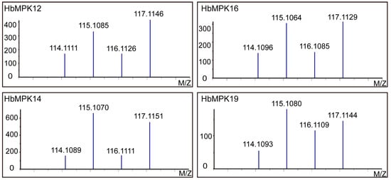 The raw spectra of isobaric tag reporters (Figure 1) and identified peptides that mapped to the HbMPKs are provided (Supplementary Figure S1). These data validated the above 20 putative HbMPKs at the proteomic level.