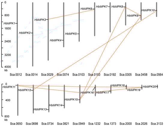 Scaffold distribution of MPK genes in Hevea. HbMPK family members were distributed onto 20 individual scaffolds. Scaffolds are represented by vertical columns, and scaffold numbers are shown at the bottom. Scale bars are on the left. Red lines connect paralogues.