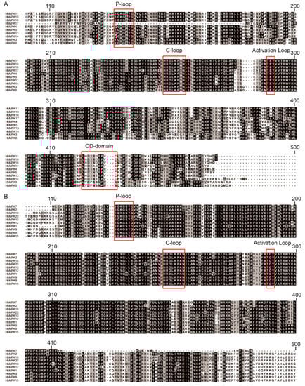 Multiple sequence alignment of the MPK proteins in Hevea. Conserved regions are shadowed. (A) Ten HbMPK members that contain a Thr-Glu-Tyr (TEY) activation site and a CD-domain; (B) Ten HbMPK members that contain a Thr-Asp-Tyr (TDY) active site. The alignment regions range from amino acids 100 to 500; each line consists of 100 amino acids. The four conserved domains (P-loop, C-loop, activation loop and CD-domain) are marked in red boxes.