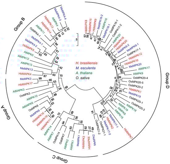 Phylogenetic tree of the MPK family in Arabidopsis thaliana, Oryza sativa, Manihot esculenta, and Hevea brasiliensis. The phylogenetic tree was constructed by ClustalX 2.0 and MEGA5.0 software using the neighbour-joining (NJ) method and 1000 bootstrap replicates. The names of the MPKs from the four species are shown in different colours. Four distinct clades (groups A–D) are highlighted. The vertical bar indicates evolutionary distance.
