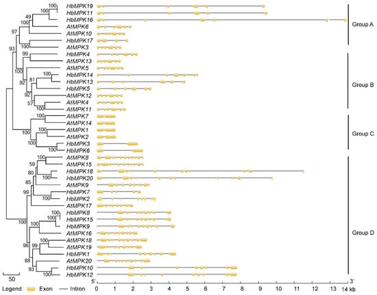 Phylogenetic and exon-intron structure analyses of MPK genes in Arabidopsis (At) and Hevea (Hb). The cladogram (left) was constructed using MEGA5.0 as described above. The exon-intron distribution (right) was analysed using GSDS software. Introns and exons are represented by lines and yellow boxes. The scale bar for genomic length is indicated at the bottom.