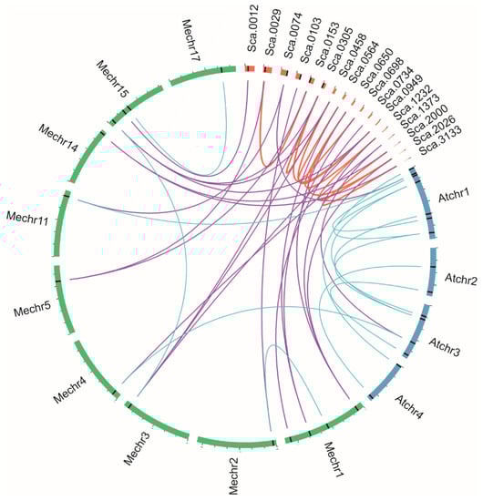 Segmental duplication of HbMPK genes and syntenic analysis of Hevea, M. esculenta, and A. thaliana MPKs. Chromosomes and scaffolds are shown in different colour in circular form. The positions of the MPK genes are marked by black lines on the circle. Duplicated MPK pairs in Hevea are connected by red lines. Syntenic relationships between Hevea and the other two species are connected by purple lines. Blue lines indicate MPK pairs between or inside M. esculenta and A. thaliana.