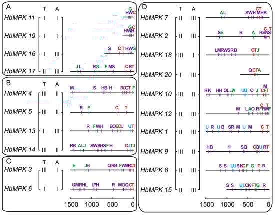 The distribution of cis-elements in the promoter regions of HbMPKs was further investigated to demonstrate the regulatory patterns of the MPK family members, especially duplicated paralogues (Figure 9). To facilitate this understanding, cis-elements were symbolised by capital letters in different colour; detailed classification and sequence information are listed (Supplementary Table S2). No significant positive correlations were observed between the distribution patterns of cis-elements and the expression patterns of HbMPKs, partly because of the lack of promoter sequence information for several genes. However, we did observe different cis-element organisational patterns in paralogues that exhibited different expression patterns in various tissues and/or under different abiotic stresses (HbMPK3–HbMPK6, HbMPK10–HbMPK12, and HbMPK11/19–HbMPK16). These results suggest the existence of different regulatory patterns and potential evolutionary fates in these paralogues.