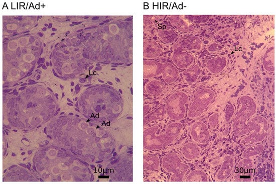 Semi-thin sections of prepubertal cryptorchid testes. (A) Low infertility risk (LIR/Ad+) testes and (B) high infertility risk (HIR/Ad−) testes. Atrophic Leydig cells (LC) and a severe reduction of germ cells is a typical picture in cryptorchid boys with defective mini-puberty (Ad− group). Dark type (Ad) spermatogonia, juvenile LC and germ cells (Sp) are indicated with arrow heads.