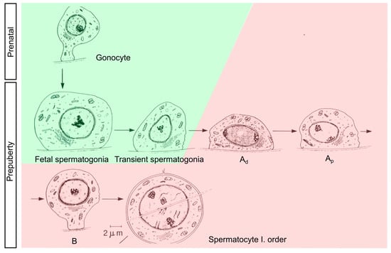 During mini-puberty, which occurs between 30 and 90 days of postnatal life in male infants, the substantial increase in gonadotropin releasing hormone (GnRH) secretion induces gonadotropin and testosterone production [1,2,3]. As a consequence, transformation of gonocytes into adult dark (Ad) spermatogonia takes place. Ad spermatogonia have a characteristic nuclear feature that distinguishes them from the other germ cells (e.g., fetal, transient, and pale-type (Ap) spermatogonia) (Figure 1 and Figure 2). Ad spermatogonia appear at three months of age and remain present in the testes for the rest of an individual’s life. Therefore, the transformation of gonocytes into Ad spermatogonia, either directly or through intermediate stages, is not simply another step in a succession of developmental stages, but a major transformation. It represents the switch from a fetal reservoir of stem cells (gonocytes) to an adult reservoir of stem cells (Ad spermatogonia), from which all future germ cells are generated [4,5,6]. Insufficient testosterone levels fail to direct gonocytes into the differentiation process in boys with defective mini-puberty, resulting in both abrogated Ad spermatogonia development and infertility [7,8,9].