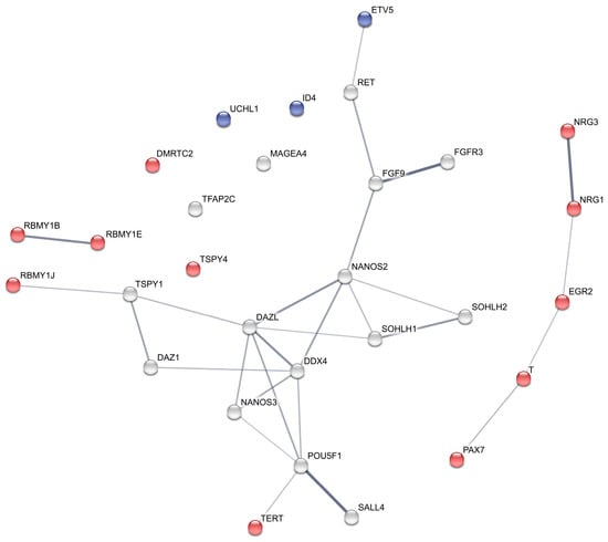 Protein interaction network of differentially expressed gonocyte and spermatogonial marker genes in Ad−/Ad+ and after GnRHa treatment. Protein coding genes which up- or downregulated after GnRHa treatment are represented by red and blue nodes, respectively. STRING was used to predict the protein interaction network [25] with a confidence cut-off of 0.4. Line-weight represents the strength of data support between the predicted interactions.