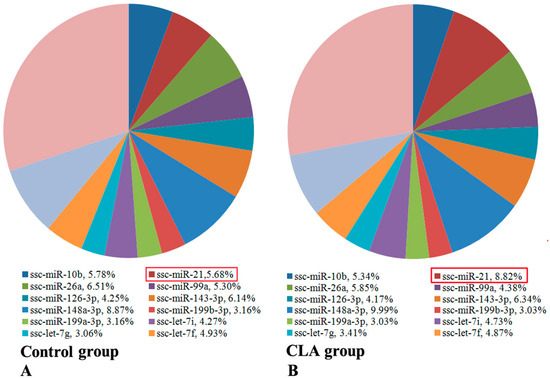 In the known porcine miRNAs, a large number of miRNAs were located on Chr X (32 miRNAs), Chr 1 (24 miRNAs), and Chr 2 (21 miRNAs), while only 12 miRNAs in total were mapped to Chr 8, 15, and 16 (Table S6). We found that 13 miRNAs (ssc-miR-10b, -21, -26a, -99a, -126-3p, -143-3p, -148a-3p, -199a-3p, -199b-3p, -let-7i, -let-7g, -let-7f, and -let-7a) were highly expressed in both subcutaneous and abdominal adipose tissues from deep sequencing. These 13 miRNAs accounted for 69.91% and 72.01% of all of the known miRNAs in the control group and the CLA treatment group, respectively. The remaining miRNAs were expressed at lower levels. Among 13 miRNAs, ssc-miR-21 expression was significantly upregulated following treatment with CLA (Figure 1 and Table S7).