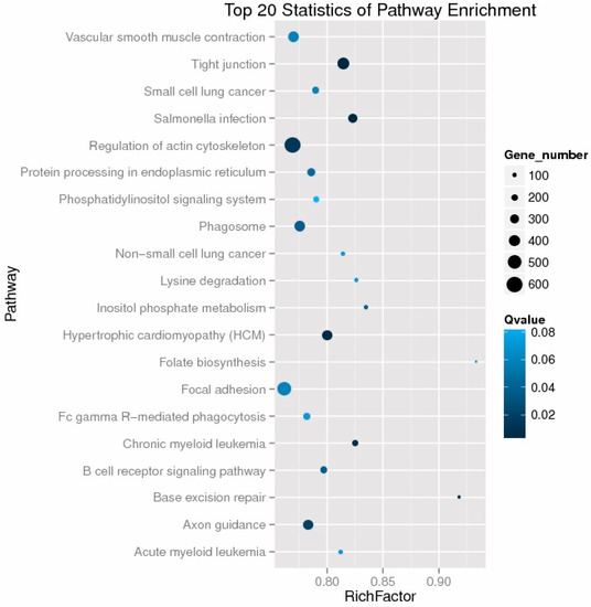 To better understand the biologicalfunction of 14 DE miRNAs, we used miRanda and TargetScan software to predict the target genes and extracted the intersection of the two methods as a prediction result. Subsequent KEGG Orthology analysis was performed to reveal the main pathways in which the target genes may be involved; 49 significantly enriched KEGG pathways were identified (p < 0.05) (Table S11). The top 20 enriched pathways for the target genes of the 14 DE miRNAs are shown in Figure 3. In the 49 significant KEGG pathways, seven pathways were associated with cancer, including pathways in cancer, small cell lung cancer, prostate cancer, pancreatic cancer, colorectal cancer, thyroid cancer, and non-small cell lung cancer. The Notch signalling and Wnt signalling pathways are involved in adipogenesis, and the adipocytokine signalling pathway is correlated with the production of leptin and adiponectin [22,23,24]. Another two pathways, the inositol phosphate metabolism pathway and the phosphatidylinositol signalling system, are important for lipid metabolism [25,26]. GOseq and topGO were used to describe the enrichment level for each GO term. The analysis showed that the most significantly enriched terms were cellular process, cell/cell part, and binding under the biological process, cellular component, and molecular function categories, respectively (Figure S2).