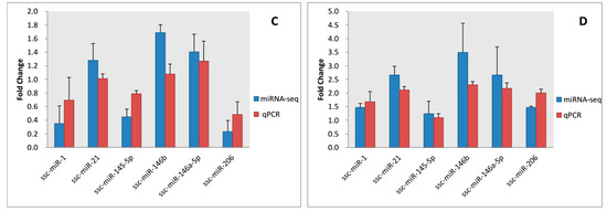 Six DE miRNAs (ssc-miR-1, -21, 145-5p, -146b, -146a-5p, and -206) were selected for qPCR to validate the RNA sequencing results. The Pearson’s correlation coefficients for the expression results were 0.902 (p = 0.014), 0.775 (p = 0.071), and 0.904 (p = 0.013) at 30, 90, and 240 days old in subcutaneous adipose, respectively, and 0.799 (p = 0.057) at 240 days old in abdominal adipose (Figure 4). The results confirmed positive correlations between the qPCR results and the miRNA-sequencing data.