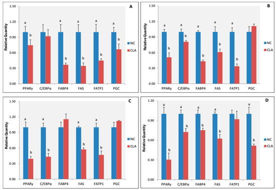 Expression level of adipogenic transcription factors and adipocyte genes in subcutaneous adipose tissues and abdominal adipose tissues of pigs. NC: control group; CLA: CLA treatment group. (A) dorsal subcutaneous adipose tissue at 30 days old; (B) dorsal subcutaneous adipose tissue at 90 days old; (C) dorsal subcutaneous adipose tissue at 240 days old; (D) abdominal adipose tissue at 240 days old. Upper letters (a, b) on bars denote significantly different expression levels in the same gene (p < 0.05).