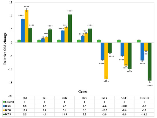 In this study, qRT-PCR was utilised to analyse the mRNA levels of apoptotic markers such as Bcl-2, Bax, p53, p21, AKT1, ERK1/2, and JNK in MCF-7 cells in the exposure of ZnO NPs at different concentrations (IC25, IC50, and IC75) for 24 h (Figure 4). The expression of the p53 gene in the treated MCF-7 cells was shown to be upregulated by 8.8 and 12.1-fold using IC25 and IC50 (p < 0.0001). The p21 expression was notably upregulated (p < 0.0001) at 24 h by approximately 1.5, 2.1, and 4.9-fold, at the tested concentrations of IC25, IC50, and IC75, respectively. Moreover, the expression level of total JNK increased significantly (IC25: 4.5-fold, IC50: 5.9-fold, and IC75: 10.5-fold) compared to the control in 24 h (p < 0.0001). (Figure 4). A significant increase in mRNA level of Bax was seen in MCF-7 cells after treatment with IC50 and IC75 (3.6 and 5.2-fold) respectively (p < 0.0001). On the other hand, treated MCF-7 cells showed Bcl-2 downregulation by ZnO NPs at IC25 and IC50, by –6.6 and –13.5 fold, respectively. Similarly, ZnO NPs had a major effect on the expression of AKT1 in MCF-7 cells, since it decreased the levels of AKT1 with IC25, IC50, and IC75 concentrations by –5.08, –8.6 and –9.9 fold, respectively. Figure 4 shows that the expression of ERK1/2 of MCF-7 cells treated with IC25, IC50, and IC75 of ZnO NPs was substantially downregulated (p < 0.0001) at 24 h by –6.7-, –3.2, and –14.2 fold, respectively, compared to control.