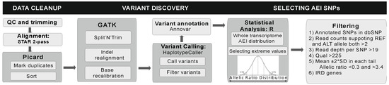 The whole procedure, detailed in Figure 1, was carried out following the GATK (Genome Analysis Toolkit) best practice (https://software.broadinstitute.org/gatk/documentation/article.php?id=3891). In brief, trimmed reads were aligned to the human genome (UCSC (University of California Santa Cruz) genome browser version hg19; https://genome.ucsc.edu/) [20] with two sequential passes of STAR (ultrafast universal RNA-seq aligner) [21]. Duplicate reads and sorting were performed with Picard. The splicing-junction re-alignment, local re-alignment, and base quality recalibration were performed with GATK. The variant calling and variant annotation were carried out with GATK’s Haplotype Caller and Annovar, respectively.