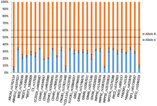 Representation of the relative allelic percentage (mean ± standard error of the mean or SEM). Shown are those SNPs in inherited retinal diseases (IRD) genes displaying allelic expression imbalance (AEI) frequencies higher than 10% in the 52 RNA-seq sample-set. Genes associated with autosomal dominant inherited IRDs are marked with an asterisk. Allelic balance is delimited within the 40–60% range.