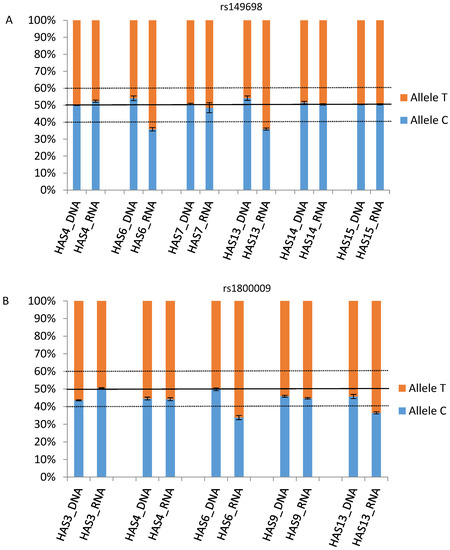 Relative allele percentages for SNPs rs149698 and rs1800009in BEST1 at the DNA and RNA levels. Allelic balance is delimited within the 40–60% range. Error bars correspond to the standard of the mean (SEM) of allele A. (A) BEST1 rs149698 pyrosequencing results. Allele percentages at the DNA level remained close to 50%. At the RNA level, there was a bias in HAS6 and HAS13 in favor of allele T. (B) BEST1 rs1800009 pyrosequencing results. Similar to rs149698, the DNA levels remained balanced, whereas at the RNA level again HAS6 and HAS13 allele T were overrepresented.