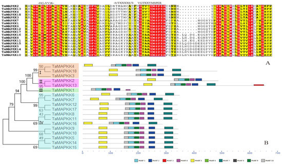 Phylogenetic relationship and conserved motifs compositions of the wheat MAPKK family. (A) Multiple alignments and conserved signature motifs found in the protein sequences of wheat MAPKK family; (B) Phylogenetic analysis (left) and conserved domain compositions (right) in wheat MAPKK family. The unrooted phylogenetic tree was constructed by MEGA 6.0 using the neighbor-joining method and the bootstrap test method with 1000 replications. Conserved motifs were predicated by MEME tool and each motif was represented with different colored boxes.