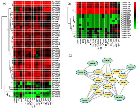 Expression patterns and interaction network of MAPK/MAPKK genes in wheat. (A) Relative expression levels of MAPK genes in various tissues and under different abiotic stresses determined using RNA-seq. Red represents increased and green represents decreased expression level; (B) Relative expression level of wheat MAPKK genes in various tissues and under abiotic stresses determined using RNA-seq; (C) The interaction network of MAPK/MAPKK genes in wheat.