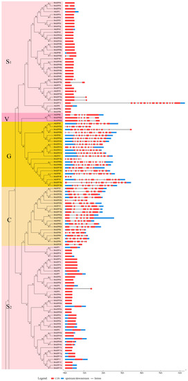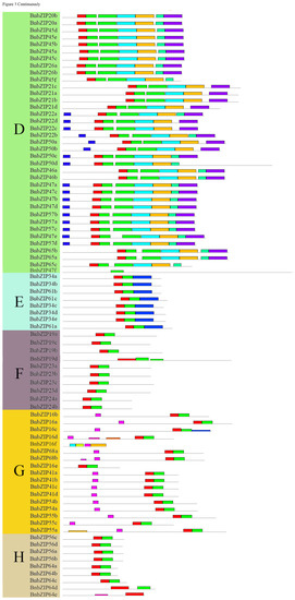 To explore the structural diversity of the BnbZIP genes, we analyzed their intron-exon structures using GSDS. The number of exons varies from 1 to 16, indicating a high degree of divergence among the 247 BnbZIP genes (Figure 2, Table S2). However, the exon-intron structures of the genes are more highly conserved within a single subgroup. For example, most genes with uninterrupted open reading frames (ORFs) are found in Group S (Figure 2, Table S2). However, among the genes in Group S, BnbZIP1c has 16 exons, while BnbZIP3h, BnbZIP5b, BnbZIP75a, BnbZIP75b, BnbZIP44b, BnbZIP44c, BnbZIP58d, BnbZIP70a, and BnbZIP70b each have two exons (Figure 2, Table S2). Additionally, genes in Group D and G have 5–11 and 2–13 introns, respectively, indicating that some subgroups are highly divergent. We also identified highly paralogous pairs among the BnbZIP genes with relatively high bootstrap support (>99%), such as BnbZIP41c–BnbZIP41d, BnbZIP16a–BnbZIP16b, BnbZIP27a–BnbZIP27c, BnbZIP12a–BnbZIP12b, BnbZIP22a–BnbZIP22b, BnbZIP30a–BnbZIP30b, and BnbZIP69a–BnbZIP69c.