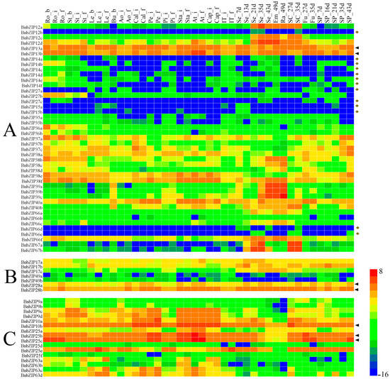 Heatmap of the expression levels of B. napus bZIP transcription factor family genes during different periods of development in different tissues and organs. Each subfamily is represented by a different uppercase letter (A–I, S, U–W). The black triangles correspond to higher expression levels in all tissues during the whole development, and the yellow diamonds correspond to lower expression levels in all tissues during the whole development. The abbreviations combinations above the heatmap indicate the different tissues and organs/developmental stages from B. napus ZS11 (listed in Table S3). The “scale” function in R was used to normalize relative expression levels (R = log2/FPKM). The heatmap was generated using Heatmap Illustrator (HemI) [40].
