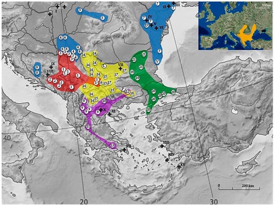 - Savic, I.R. Diversification of the Balkan fauna: Its origin, historical development and present status. In Advances in Arachnology and Developmental Biology Papers dedicated to Prof. Dr. Božidar Ćurčić; Makarov, S.E., Dimitrijević, R.N., Eds.; Inst. Zool.: Belgrade, Serbia; BAS: Sofia, Belgrade; Fac. Life Sci.: Vienna, Austria; SASA: Belgrade, Serbia; UNESCO MAB: Belgrade, Serbia, 2008; Volume 12, pp. 57–78. [Google Scholar]