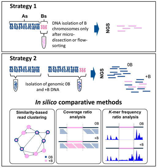 Various strategies have been elaborated to identify B chromosome sequences from NGS-acquired data. This section summarizes the differences between the direct and indirect (comparative) methods (Figure 1).