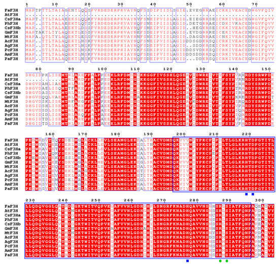 Multiple alignment of two CsF3H proteins with F3Hs from other plants. The blue and green symbols represent the iron binding sites and 2-oxoglutarate binding sites, respectively. The box represents the conserved area of the 2-oxoglutarate-dependent dioxygenase (2-ODD) family.