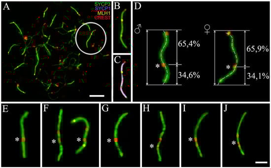 Variations of a centromere position in the submetacentric chromosome in the early meiotic prophase I of mole voles. Axial elements were identified using anti-SYCP3 antibodies (green), central element usinganti-SYCP1 (magenta), recombination nodules usinganti-MLH1 (yellow), and anti-CREST for kinetochores (red). The asterisk shows the location of the centromeric signal of the submetacentric homolog (33–35% of the telomere end). The red signal without asterisk marked erratic centromere positions in the submetacentric. (A) spermatocytes from interspecific hybrids F1 of Ellobius talpinus (2n = 54) × Ellobius tancrei (2n = 34). Bar = 5 µm. A submetacentric is in the circle (inset (B–C)); (D) heteromorphic bivalent in females and males of the interspecific hybrid of mole voles. One centromeric signal originated from the acrocentric homologue of E. talpinus, the other from the submetacentric homologue of E. tancrei. A submetacentric chromosome from karyotypes of E. tancrei 2n = 54, male (E); E. tancrei 2n = 34, female (F); E. tancrei, intraspecific hybrid 2n = 50, male (G) and female (H); E. tancrei, intraspecific hybrid, 2n = 49, male (I) and female (J). Bar (E–J) = 2 µm.
