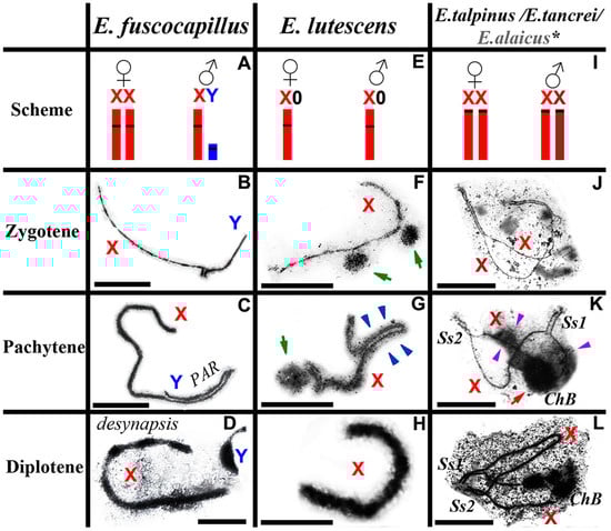 - Kolomiets, O.L.; Matveevsky, S.N.; Bakloushinskaya, I.Y. Sexual dimorphism in prophase I of meiosis in the Northern mole vole (Ellobius talpinus Pallas, 1770) with isomorphic (XX) chromosomes in males and females. Comp. Cytogenet. 2010, 4, 55–66. [Google Scholar] [CrossRef]