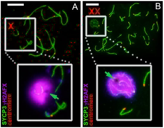 Sibling species E. talpinus, E. tancrei and E. alaicus maintained a unique system of sex chromosomes, XХ♂/XХ♀ (Figure 2I). Their X chromosomes were large acrocentrics with identical G-band patterns. Starting from the zygotene stage, the X chromosomes synapsed between the short telomeric regions (Synaptic sites; Ss1, Ss2) and remained asynaptic in the central zone (Figure 2J,K) [,,,,]. Starting from the late zygotene stage, in the structure of the sex bivalent, a rounded electron-dense chromatin body intensively stained by AgNO3, formed. Sometimes, a less intense electron-dense cloud spread along one of the x-axes from the round body (ChB) toward the synaptic sites (Figure 2K). The shape and argyrophility of this round structure led to the conclusion about the nucleolar nature of this structure, previously denoted as a nucleolus-like body. Later, by the immunofluorescence studies, it was found that this structure binds intensely to DAPI, resulting in the assumption that it was DNA. Chromatin inactivation was believed to occur due to the density of this structure []. However, it became clear that, after immunostaining of the spread nuclei with antibodies to the histone γH2AFX, this structure appeared to be often (but not always) γH2AFX negative (Figure 3). These results encourage continued research on the issue.