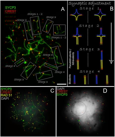 Tetraploid early pachytene spermatocyte from E. talpinus with stable karyotype (2n = 54, NF = 54). Axial SC elements were identified using anti-SYCP3 antibodies (green), anti-CREST for kinetochores (red), DNA double-strand break (DSB) loci immunostained with antibodies against the RAD51 protein (yellow). Chromatin was stained with DAPI (gray). Pseudo-bivalents (tetravalents) at the different stages of synapsis were in the nuclei (A). Four homologous adjusted sequentially, forming double bivalent/pseudo-bivalent (tetravalent) and then individual bivalents (B). RAD51-signals are absent in some fully synaptic bivalents (C). The denser chromatin occupied the central part of the nucleus, where it is assumed a sex tetravalent was located (a black circle, (D)). Bar = 5 µm.