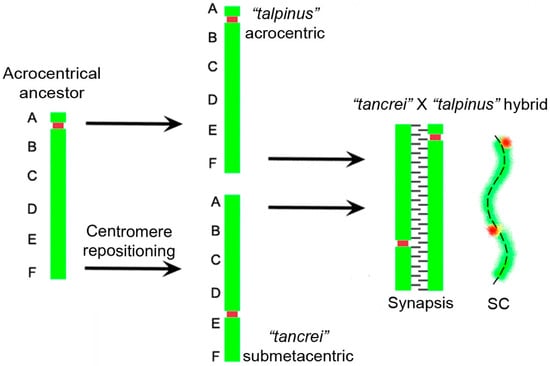 In some cases, a linear heteromorphic bivalent can be observed due to linear correction of nonhomologous regions, and subsequent re-synapsis of the axes. The phenomenon is known as synaptic adjustment []. Another possible explanation for the case is centromere repositioning or the emergence of an evolutionary new centromere. To confirm or refute the hypotheses, it is necessary to clarify the distribution of recombination sites in the heteromorphic bivalent of interspecies hybrids. No recombination sites between the centromeric signals of the acrocentric and submetacentric homologs of the heteromorphic bivalent will indicate that, despite the inverted arm of the chromosome being paired with the non-inverted one, the synapsis is nonhomologous and recombination is impossible. Earlier, it was shown that the inversion loop did not form, suggesting that the emergence of this submetacentric was most likely due to centromere repositioning [,]. New data on immunodetecting of MLH1, which is a crossover marker, allowed for the hypothesis that a recombination nodule formed between the centromeric signals, closer to the centromere of the acrocentric homolog (Figure 1B–D). Thus, absence of synaptic adjustment allowed for the supposition that this submetacentric arose due to de novo formation of the centromere instead of inversion (Figure 5). Inactivation of the old centromere was accompanied by loss or erosion of the near-centomeric heterochromatin []. All of these features are typical for the evolutionary new centromeres. Other species, for example, in cucumbers and watermelon, the emergence of new centromeres was accompanied by the attendance of large blocks of heterochromatin and, as in this case, the loss of heterochromatin in the region of the old centromere []. Probably, the submetacentric in E. tancrei is an evolutionarily young chromosome, and the centromeric heterochromatin is still growing. Consequently, this might be an explanation for the centromere lability, i.e., a phenomenon, when the position of the centromere in the submetacentric is ´not fixed´ strictly. The differences in the form of homologues are apparent at mitotic metaphases. The variability in the position of the centromere was confirmed by observing several centromeric signals in this submetacentric chromosome, when the prophase I of meiosis of different chromosomal forms and intraspecific hybrids of E. tancrei was studied (Figure 1E–J). The origin of neocentromere in E. tancrei might correlate with its karyotype lability due to Rb translocations. There are no data on any chromosomal changes in E. talpinus, despite significant mitochondrial DNA (mtDNA) variability detected [].