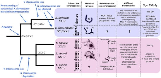 Mulugeta et al. [] suggested two independent losses of the Y for two studied species, E. lutescens and E. talpinus, and genetic predisposition toward development of a new sex-determination system in the common ancestor of mole voles. The lack of data for other species could restrict or even lead to an incorrect interpretation of the obtained results. Here, data are presented on meiotic behavior of sex chromosomes for four species. These results challenged the opinion that the Y chromosome was lost in the common ancestor of all Ellobius. Earlier, it was supposed [,], and, now, more evidence has been established for an independent loss of Y chromosomes in E. lutescens and in the subgenus Ellobius after their separation. It is believed that two subgenera (Bramus and Ellobius) developed different pathways of copying Y-linked genes and elimination of the entire Y chromosome. Along with Y chromosome evolution, Xs demonstrate their own changes in subgenera. The subgenus Bramus X chromosomes are submetacentrics, albeit E. lutescens keeps a single X in both sexes, while E. fuscocapillus maintains the XX–XY system.