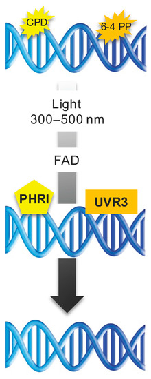 Ultraviolet-induced DNA lesions are preferentially repaired by DR using photolyases. DR is an error-free mechanism of repair [48]. Prokaryotes and most eukaryotes, excepting placental mammals, predominantly use this direct mechanism to repair DNA photolesions [48]. Photo reactivation is catalyzed by specific enzymes called DNA photolyases, which directly bind UV photoproducts and convert pyrimidine dimers to monomers using the cofactor flavine adenine dinucleotide (FAD) and UV-A/blue light (300–500 nm) [48] (Figure 1). In A. thaliana, two active photolyases are found: PHR1, also named UV resistance 2 (UVR2), acting specifically on CPDs, and UV resistance 3 (UVR3) acting specifically on 6,4 PPs [11] (Figure 1). Both photolyases prevent the accumulation of UV-B-induced genetic defects [24,28]. Moreover, the expression of these photolyases UVR3 and PHRI is controlled by the photomorphogenic regulator DET1 [49] and the DNA demethylase repressor of silencing 1 (ROS1) [15], highlighting that an interplay between photomorphogenesis, DNA methylation dynamics, and light-dependent repair mechanisms exists.