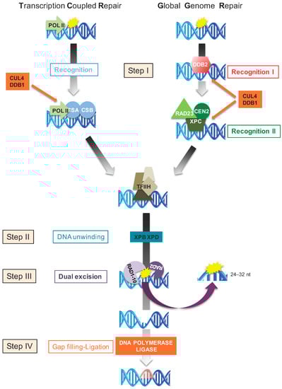 Nucleotide excision repair promotes the repair of UV-induced lesions in a light-independent manner via two sub-pathways, the transcription-coupled repair (TCR) and the global genome repair (GGR), that process bulky DNA lesions along actively transcribed DNA strands or throughout the genome, respectively [50] (Figure 2). The NER process removes DNA photolesions by the excision of 24–32 nucleotides (nt) single-strand oligonucleotides from the damaged DNA strand, followed by the restoration of an intact double helix by DNA repair synthesis (Figure 2). About 30 core proteins are mobilized during this repair process [50]. Although the recognition steps differ between TCR and GGR, the excision repair processes are similar (Figure 2).