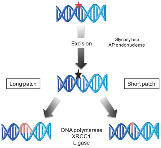 Schematic representation of the base excision repair (BER) pathway. The modified base is recognized and excised by specific DNA glycosyleases creating an abasic site. The gap is filled by a DNA polymerase and ligated by a DNA ligase and X-ray repair cross-complementing protein 1 (XRCC1). Red star: modified base; black star: 3’ blocking end. The newly synthetized DNA is shown in red.