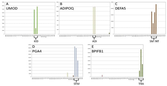 Tissue-Specific Gene Expression Exemplified by Individual Gene Candidates amongst 35 Tissue Samples. Read counts for individual biomarkers (A) UMOD (uromodulin), kidney specific; (B) ADIPOQ, adipose specific; (C) DEFA5, intestine specific; (D) PGA4, stomach specific; (E) BPIFB1, trachea specific, are shown amongst a set of 35 tissue samples (Brain (BRN), N = 5), lung (LUN, N = 3), liver (LIV, N = 4), skeletal Muscle (SKMUS, N = 4), heart (HRT, N = 4), kidney (KID, N = 3), adipose (ADI, N = 2), small intestine (SMINT, N = 4), stomach (STM, N = 3), trachea (TRA, N = 3). Colored bars represent biomarker expression (i.e., read counts) in the target tissue: light green—kidney, yellow—adipose, brown—intestine, blue—stomach, dark green—trachea). Y-axis—read counts, X-axis—tissue samples.