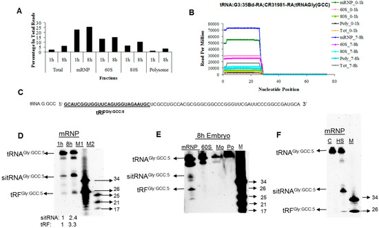 We used conventional cloning methods to validate the presence of tRFs in the mRNP fraction of 2 h embryos. The RT-PCR amplification of adaptor-linked 35–40-nt small RNAs revealed that these RNAs are present in the mRNP fraction of 2 h-embryos as well (e.g., CR31540). Northern blotting analysis showed that tRFGly:GCC:5, which is produced mainly from the 5’-end of glycine tRNA (Figure 2C), is highly expressed in the mRNP fraction (Figure 2D,E). We detected two major fragments in the sizes of 26- and 40 nt (Figure 2D,E). In accordance with the deep-sequencing data, tRFGly:GCC:5 expression was up-regulated in the mRNP fraction of 7–8 h embryos although the expression level of the corresponding mature tRNA remained unchanged (Figure 2D). Thus, we normalized RNA loading based on the mature tRNA levels in the subsequent experiments. We observed similar results in S2 cells, a cell line derived from dissociated embryos at near hatching stage [29]. tRFGly:GCC:5 was associated with non-polysomal fractions under stress (heat shock at 42 °C for 4 h) conditions (Figure 2F).