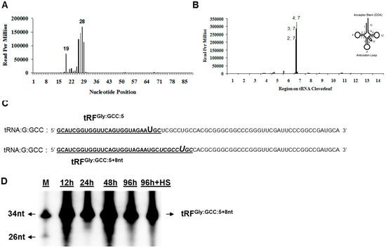 Interestingly, tRFGly:GCC:5+8nt was not shortened up to 96h post-transfection (Figure 4D). Trimming did not occur under heat shock conditions (Figure 4D, 96 h + HS) either, indicating that stress condition alone (e.g., heat shock) is not sufficient to induce trimming at the 3’end of tRFGly:GCC:5+8nt (Figure 4D, 96 h + HS).