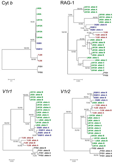 | Cyt b | RAG-1 | V1r1 | V1r2 | ||||