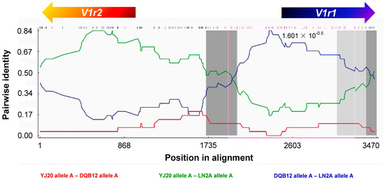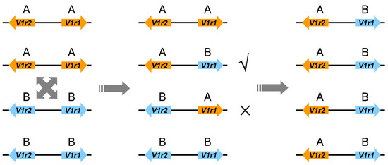 3.3. Recombination between Homoeologous V1r1-V1r2 Clusters in the Tetraploid Genome