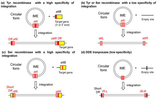 Schematic representation of the integration of IMEs encoding: (a) a tyrosine recombinase allowing high specific integration; (b) a tyrosine or serine recombinase with a low specificity of integration; (c) serine recombinase with a high specificity of integration and (d) DDE transposase. The integration is mediated by the recombinase or the DDE transposase. Most IMEs encoding a recombinase integrate in a specific attB site that corresponds to the 5′ or 3′ end of a gene (tyrosine recombinase) or is located within a gene (serine recombinase). The recombination between two short identical or almost identical sequences carried by attI and attB sites leads to DRs flanking the integrated IME. Some IMEs encoding a serine or tyrosine recombinase and the two known IMEs encoding a DDE transposase have a low specificity of integration and therefore do no integrate in a specific attB site. The integration of IMEs encoding DDE transposases leads to duplication of the targeted sequence leading to short DRs flanking the integrated IME. Attachment sites are drawn as rectangles: in red with motif, arms of the left (attL) and right (attR) attachment sites and corresponding arms of attI; in red, identical sequences found in the attB, attL, attR and attI sites. The left and right inverted repeats (IR-L and IR-R) found in IMEs encoding a DDE transposase are drawn as red arrows. The yellow rectangles indicate target gene and include a copy of the sequence found in all att sites (red rectangle).