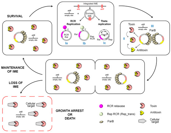 IME-encoded factors that contribute to IME maintenance in the cell during cell division: I Replication factors allowing rolling circle replication (RCR) or theta replication; II, toxin-antitoxin systems; III, partition protein ParB.