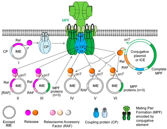 Schematic illustration of the diverse strategies of IME mobilization. Conjugative plasmids as well as integrative and conjugative elements (ICEs) encode all the proteins necessary for their autonomous transfer by conjugation, including a relaxase, relaxosome accessory factors (RAFs), a coupling protein (CP) and a Type IV secretion system (T4SS). Relaxase and RAFs are shown as colored spheres, CP as blue hexameric protein and MPF as green multimeric protein complex. IMEs can exploit conjugative elements for transfer by encoding: I, distinct relaxase and CP to recruit the MPF; II, a distinct relaxase and sometimes additional RAF to recruit the CP and MPF; III, a distinct relaxase, RAF and 3 MPF proteins to recruit the CP and T4SS; IV, only an oriT; V, an oriT and RAF to recruit the relaxase of conjugative elements; VI, an oriT and 3 MPF proteins. Interactions between elements are drawn as arrows with dotted lines.