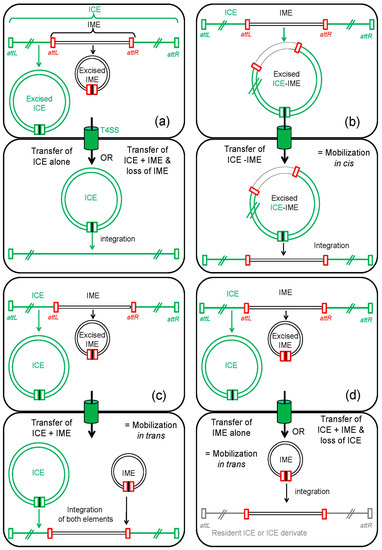 Recent works showed that at least some IMEs not only need conjugative elements to promote their own transfer but also influence the transfer or stability of host or helper conjugative elements.