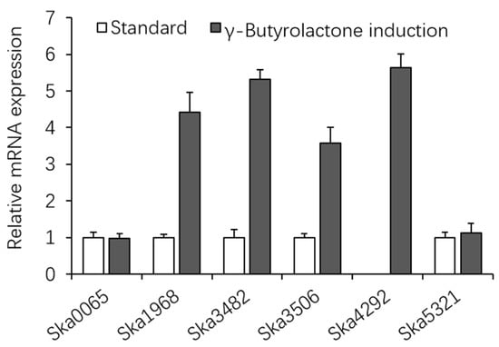 The S. kanasensis strain ZX01 was cultured in 100 mL liquid medium for 72 h, then 1 mL γ-butyrolactone (50 mM, CAS No.:96-48-0, Aladdin, Shanghai, China) was added into the liquid medium under aseptic conditions. Control groups were treated with sterile water. One day later, 10 mL of culture were centrifuged briefly to pellet the mycelium, then RNA was purified using an Eastep® Super Total RNA Extraction Kit (Promega, Madison, WI, USA). RNA was treated with amplification grade RNase-free DNaseI (Invitrogen, Carlsbad, CA, USA). In addition, the pure RNA used as the template for cDNA synthesis, then qPCR and data analysis were performed as described by Pullan et al. []. The SigA used as the reference gene. The primers of gene fragments were as follow: Ska0065, 5′-GTCGGCCAGGTCCTCGGCTACT-3′ and 5′-TCCGCACCAGGCACTCCACC-3′; Ska1968, 5′-CGCCGCAAGAGCAACAAGAGC-3′ and 5′-CGACAGCCATCTCCAGCAGCAAC-3′; Ska3482, 5′-TGTCC TCGTTCGGCATCAGCG-3′ and 5′-ACAGCACCCACGGCACCACC-3′; Ska3506, 5′-GCCAC TCGGGCCAGGAAGACAT-3′ and 5′-GCAGCACCAGGCTGTTGACGAAC-3′; Ska4292, 5′-ACTTCTGCACGGCCTACCCG-3′ and 5′-AACAGTCCGTTCGACAGCAGGTT-3′; Ska5321, 5′-ACACCGCCTGGGAGCCGTTCTT-3′ and 5′-AGGTCGGCGTGAGGTCGAGGAA-3′; SigA, 5′-CGCCGAGTCCGAGTCTGTGAT-3′ and 5′-CACTGACCATCAGC GTCACAC-3′.