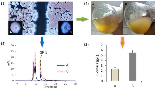 Differences between wild type and mutant of S. kanasensis ZX01 in morphology and production of glycoprotein GP-1. (A) wild type strain of S. kanasensis ZX01; (B) nsdA disruption mutant in which nsdA was replaced by kanamycin resistance gene (kan); (1) Two strains were cultivated on the Gause-I plate medium for 5 days; (2) Two strains was cultivated in GCBY liquid medium for 3 days; (3) The differences of biomass between wild type and ΔnsdA mutant; (4) Determination of glycoprotein GP-1 in wild type and ΔnsdA mutant.