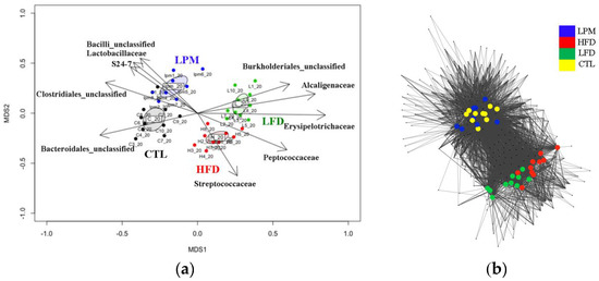 Non-metric multidimensional scaling (NMDS) analysis demonstrated that all induction methods clearly shifted the gut microbiota (p < 0.001), and network analysis clearly separated the HFD and LFD groups from the CTL and LPM groups (Figure 2).