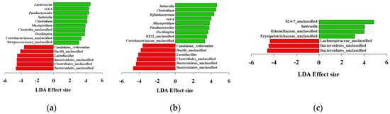 Analysis of differentially abundant genera. Red bars indicate control samples and green bars indicate high-fat diets (a); low-fiber diets (b); and loperamide administration (c).