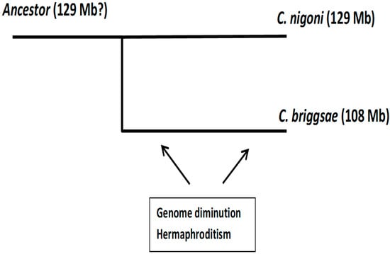 - Fierst, J.L.; Willis, J.H.; Thomas, C.G.; Wang, W.; Reynolds, R.M.; Ahearne, T.E.; Cutter, A.D.; Phillips, P.C. Reproductive mode and the evolution of genome size and structure in Caenorhabditis nematodes. PLoS Genet. 2015, 11, e1005323. [Google Scholar]