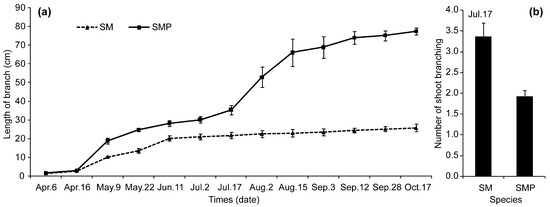 Growth (a) and shoot branching numbers (b) variation during different developmental stages. SM and SMP represent S. matsudana and S. matsudana var. pseudo-matsudana.