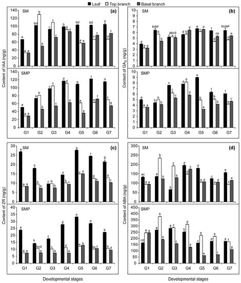 Based on our growth results, three tissues at seven developmental stages (G1–G7) were selected for the determination of endogenous hormone content (Figure 2). The maximum peak concentrations of IAA in the top branches appeared at G2 and G4 (Figure 2a). The first peak appeared in the basal branches at G4 and the second peak at G6. The first peak appeared in leaves at G2 in SM and at G4 in SMP, and both maintained higher IAA concentrations after G4. At G1 and G2, the IAA concentrations in the leaves and top branches in SM were higher than those in SMP, while conversely, from G4 they were lower than those in SMP. Throughout development, the IAA concentrations in the basal branches of SM were always higher than those in SMP.